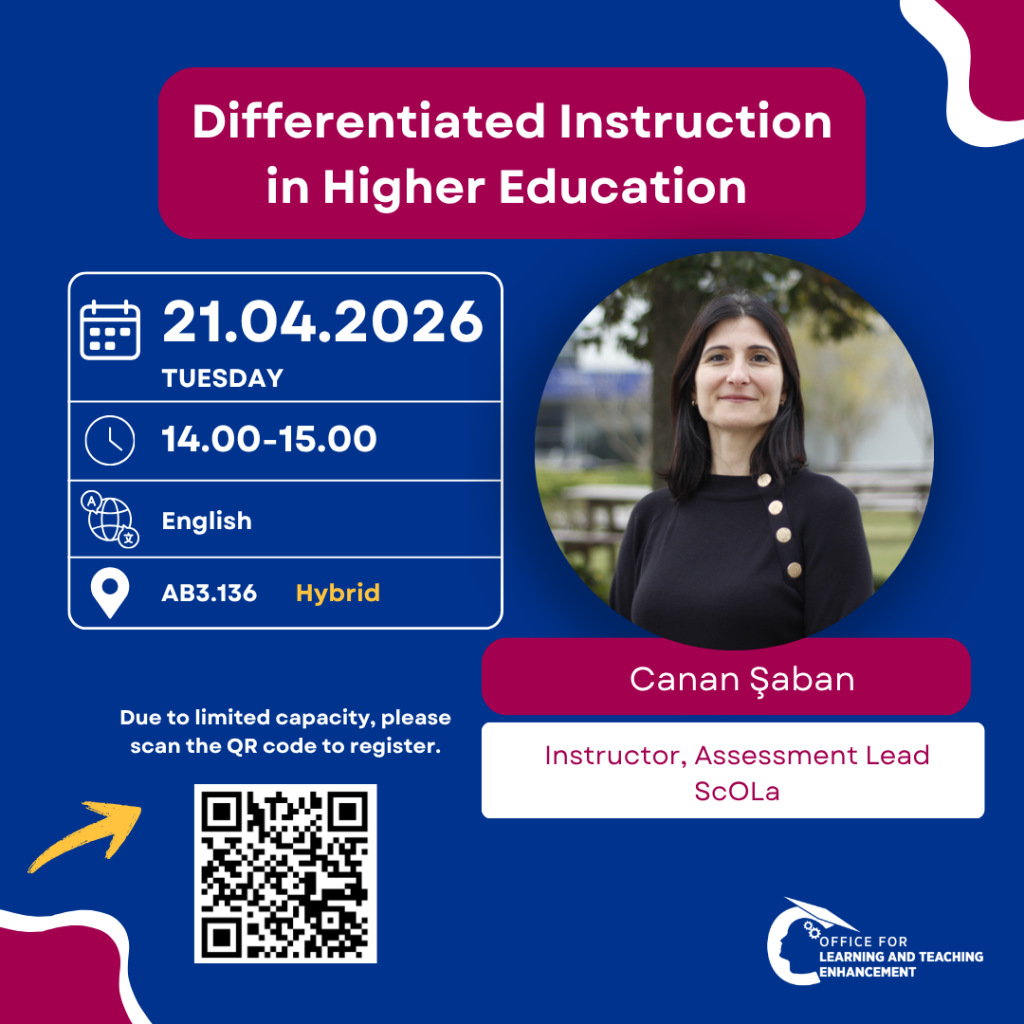 All faculty members and staff are invited to our "Differentiated Instruction in Higher Education" event, where approaches to responding to students' diverse learning needs will be discussed. The session will take place in hybrid format on Tuesday, April 21, at 14:00, in AB3.136.