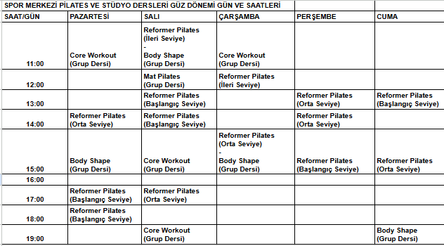 Spor Merkezi Pilates ve Stüdyo Dersleri Bahar Dönemi Gün ve Saatleri