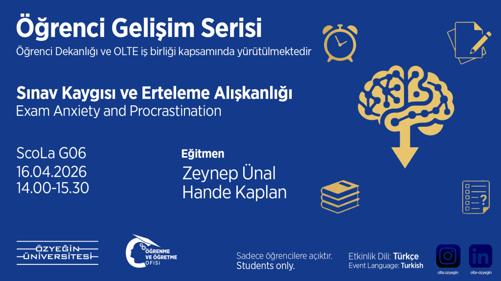 Öğrenme ve Öğretme Ofisi (OLTE) ile Öğrenci Dekanlığı iş birliğinde yürütülen Öğrenci Gelişim Serisi kapsamında düzenlenen bu etkinlikte, sınav kaygısı ve erteleme alışkanlığıyla başa çıkma yollarını birlikte keşfetmeye davetlisiniz.